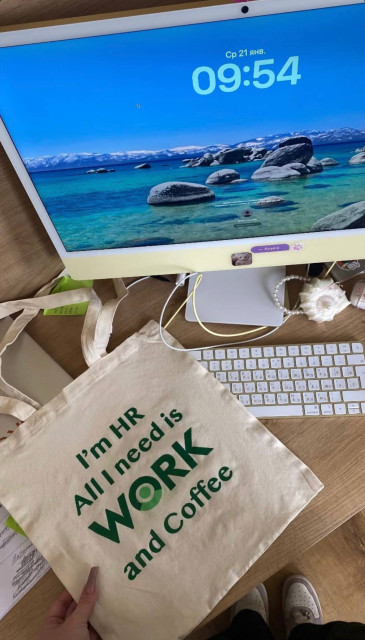 – Тканевые шопперы с нашим логотипом и тематическими надписями в сфере найма. У шопперов было 5 разных надписей, и люди получали их рандомно, а потом друг с другом обсуждали, какая надпись кому попалась.