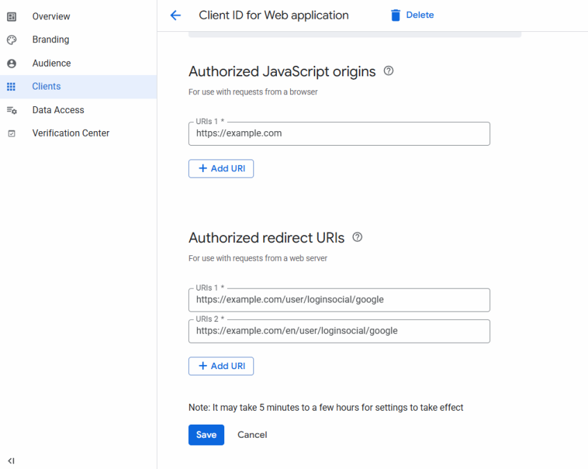 7. Далее в клиентских настройках OAuth укажите действительные URI перенаправления для OAuth, вида: