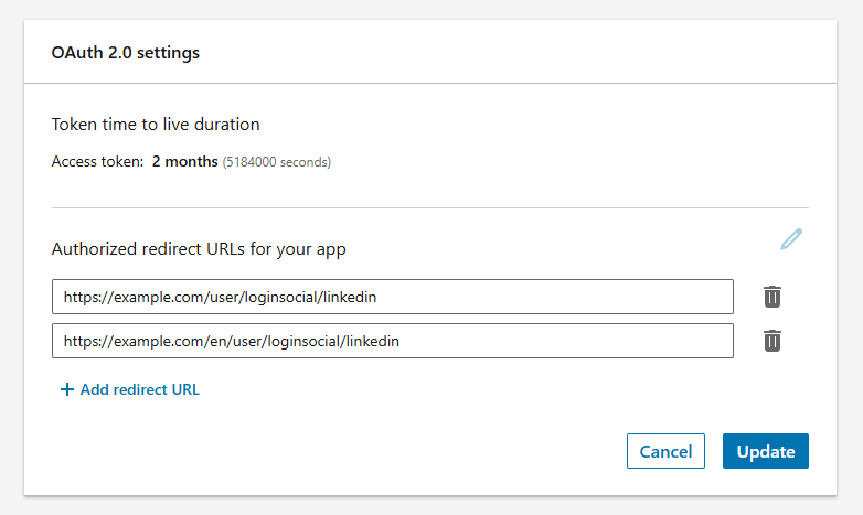 - Укажите URL-адрес, на который LinkedIn должен перенаправить пользователя после успешной авторизации, например: