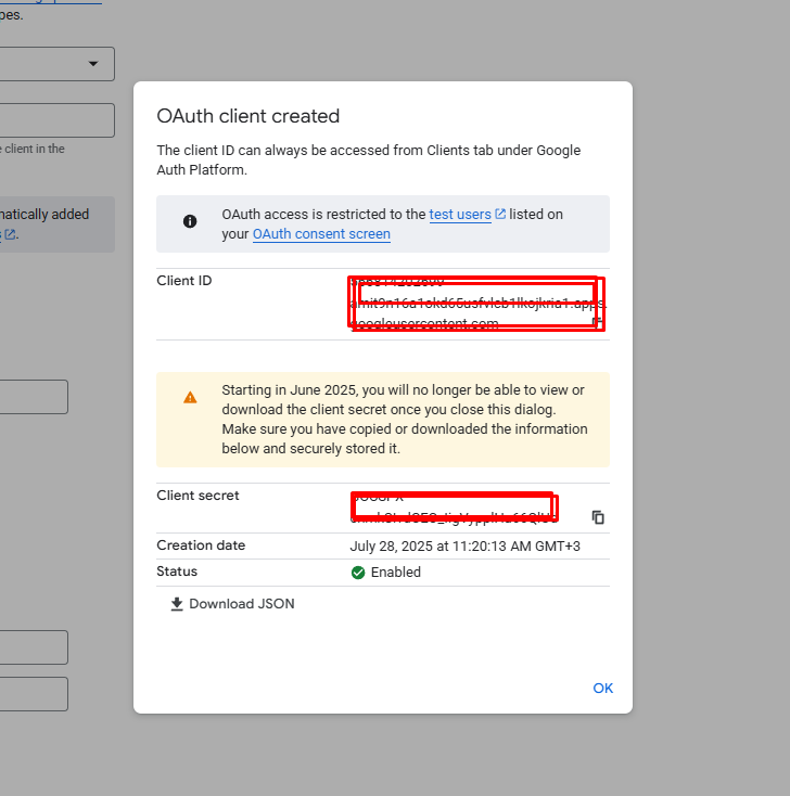 9. Нажмите Создать — вы получите Идентификатор клиента и секретный ключ клиента.