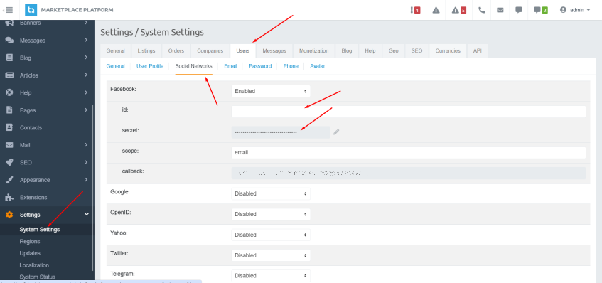 Настройки системы → Пользователи → Социальные сети.В разделе Google введите идентификатор клиента и секретный ключ клиента.