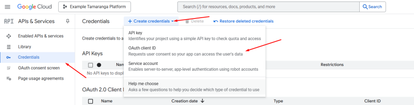 - Нажмите Создать учетные данные → Идентификатор клиента OAuth.