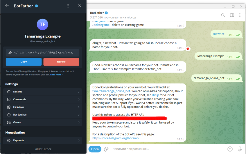 - После создания BotFather предоставит вам токен API (например,