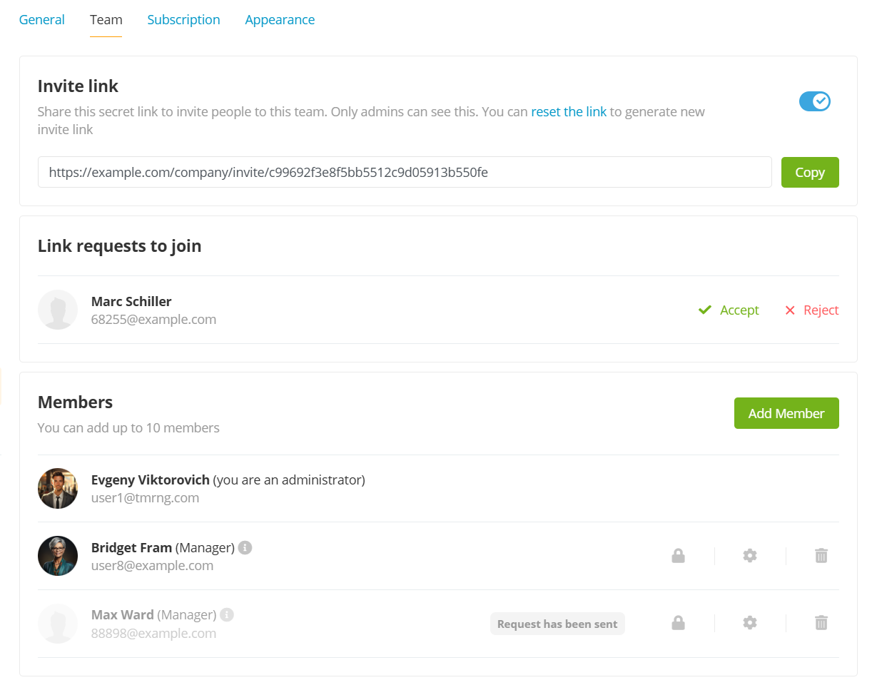 У компании появляется возможность управлять командой — пользователями, профили которых закреплены за профилем компании.
