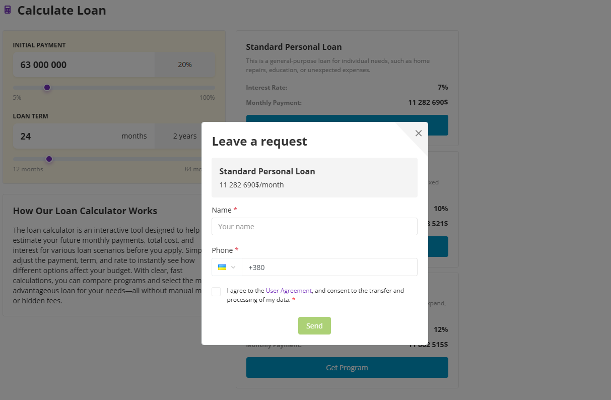 Каждая программа имеет кнопку «Получить программу», открывающую форму заявки с выбранным тарифом и рассчитанным ежемесячным платежом. В заявке пользователь указывает контактные данные, после чего запрос поступает в админ-панель или же в компанию для обработки.