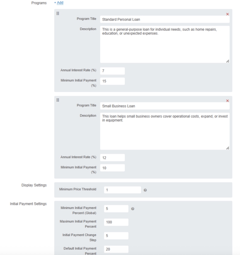 Администратор может создавать различные кредитные программы, настраивать параметры расчётов и управлять отображением калькулятора. Количество программ неограниченно, каждая из них содержит: