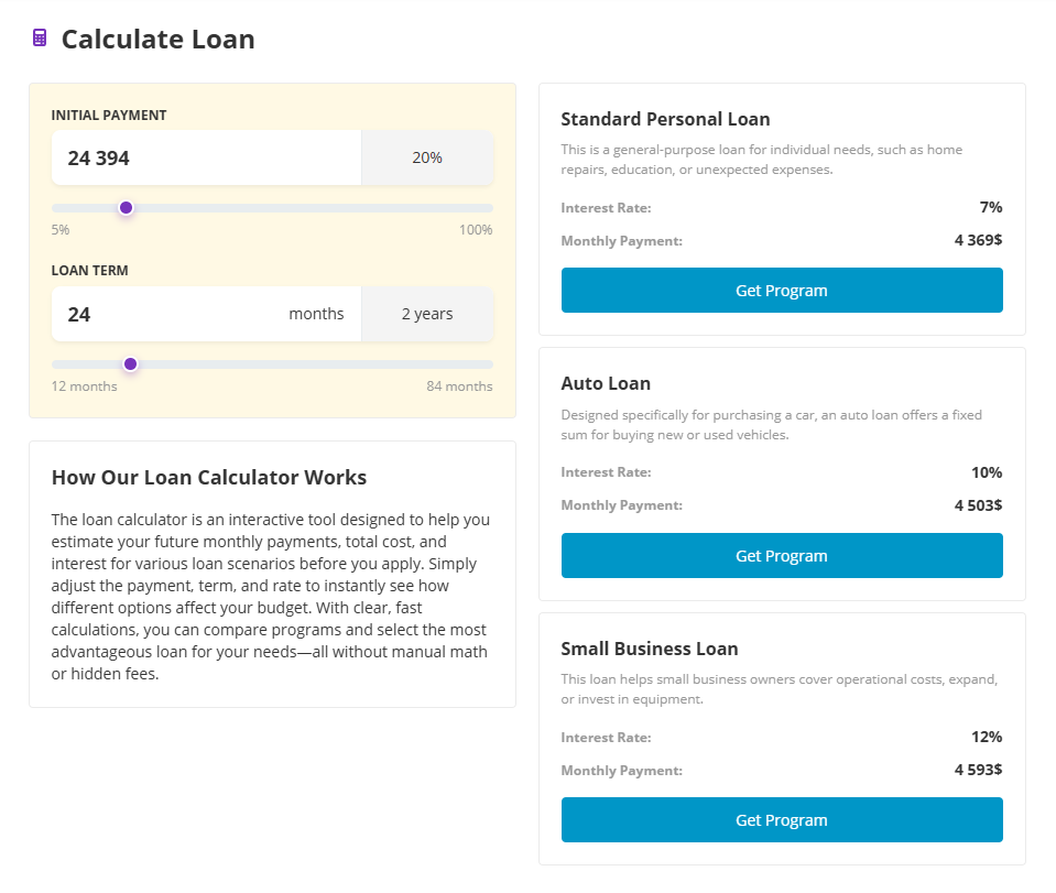 Модуль кредитного калькулятора позволяет пользователям легко рассчитывать условия займа и отправлять заявку напрямую через интерфейс сайта на странице предложения.