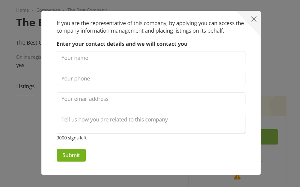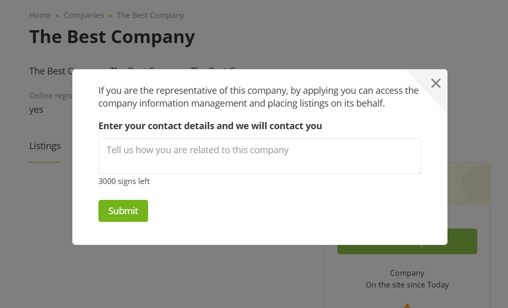 Модуль дает возможность пользователю открыть свою компанию (магазин) и публиковать предложения от её имени.