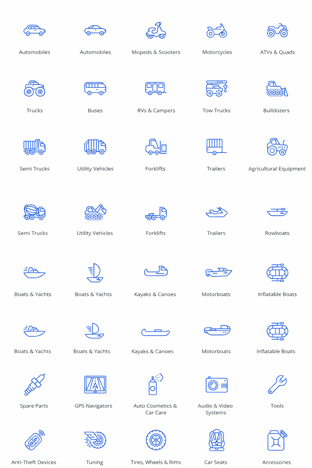 Набор из 35 стильных контурных иконок на авто тематику для категорий доски объявлений или маркетплейса. Иконки выполнены в формате SVG и PNG.