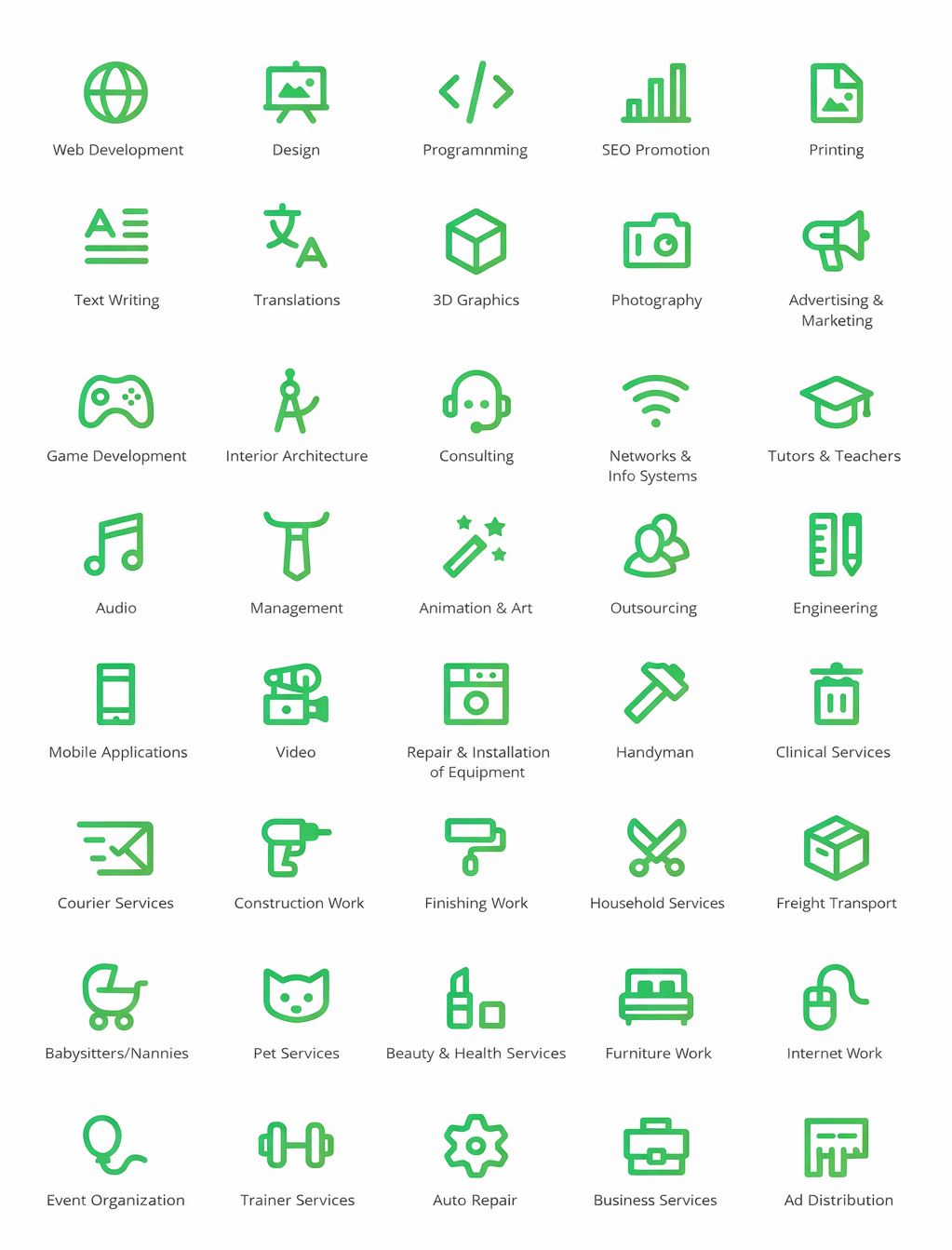 Набор из 40 стильных контурных иконок для биржи услуг. Иконки выполнены в формате SVG и PNG.