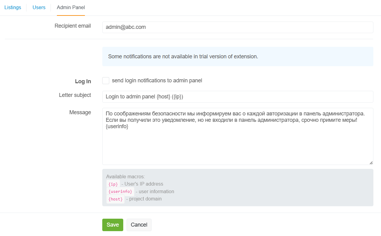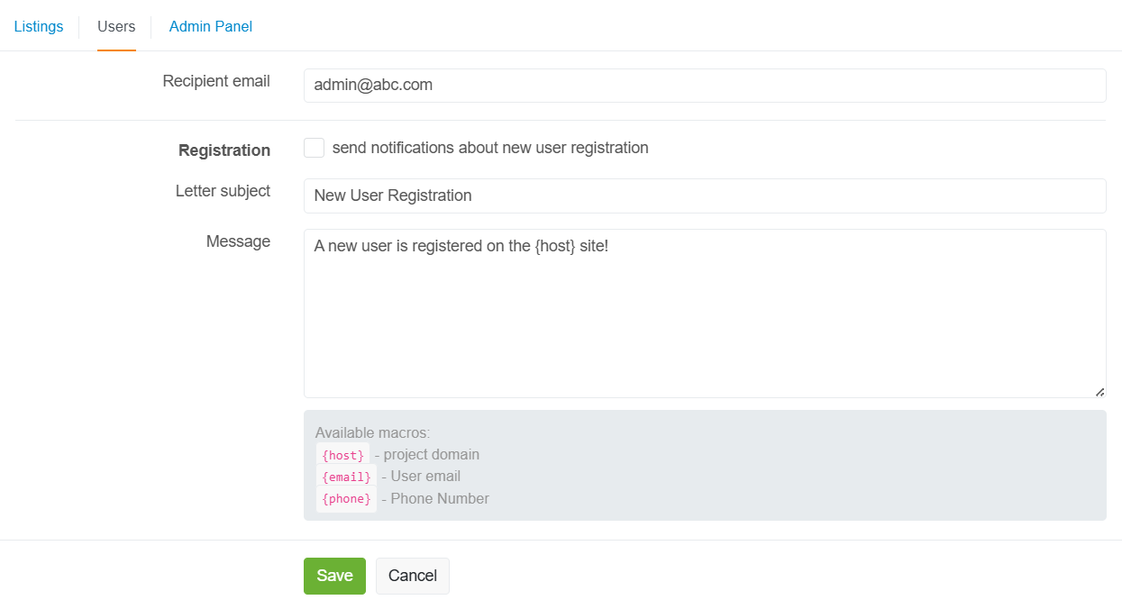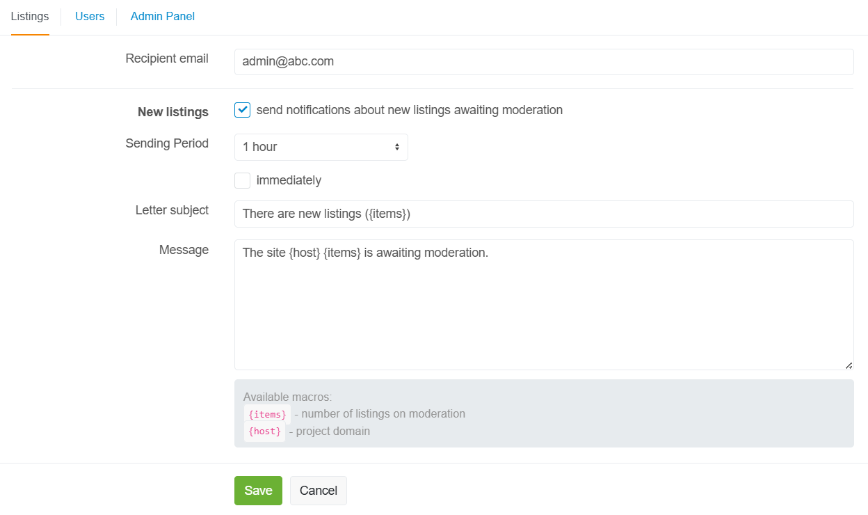 Доступна возможность указать тему письма и сообщение для каждого события, а также указать email адрес получателя, например в случае с событием публикации объявления может быть указан email модератора проекта.